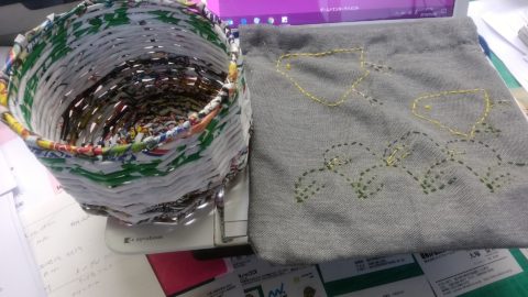 手作りのかごと、巾着袋です。