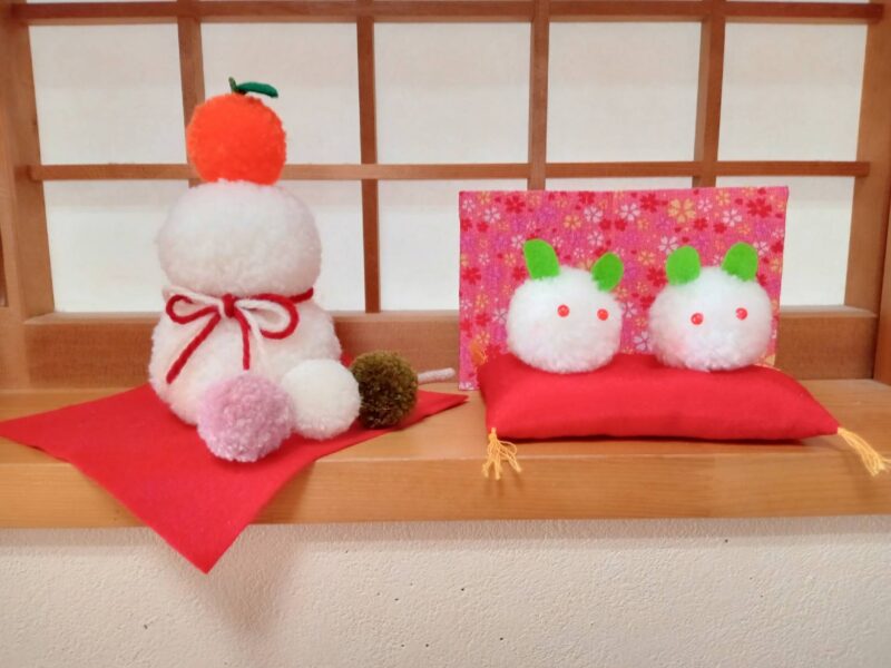 1月の行事にて、毛糸のポンポンを使った、お供え餅と雪うさぎのリース、置き物を